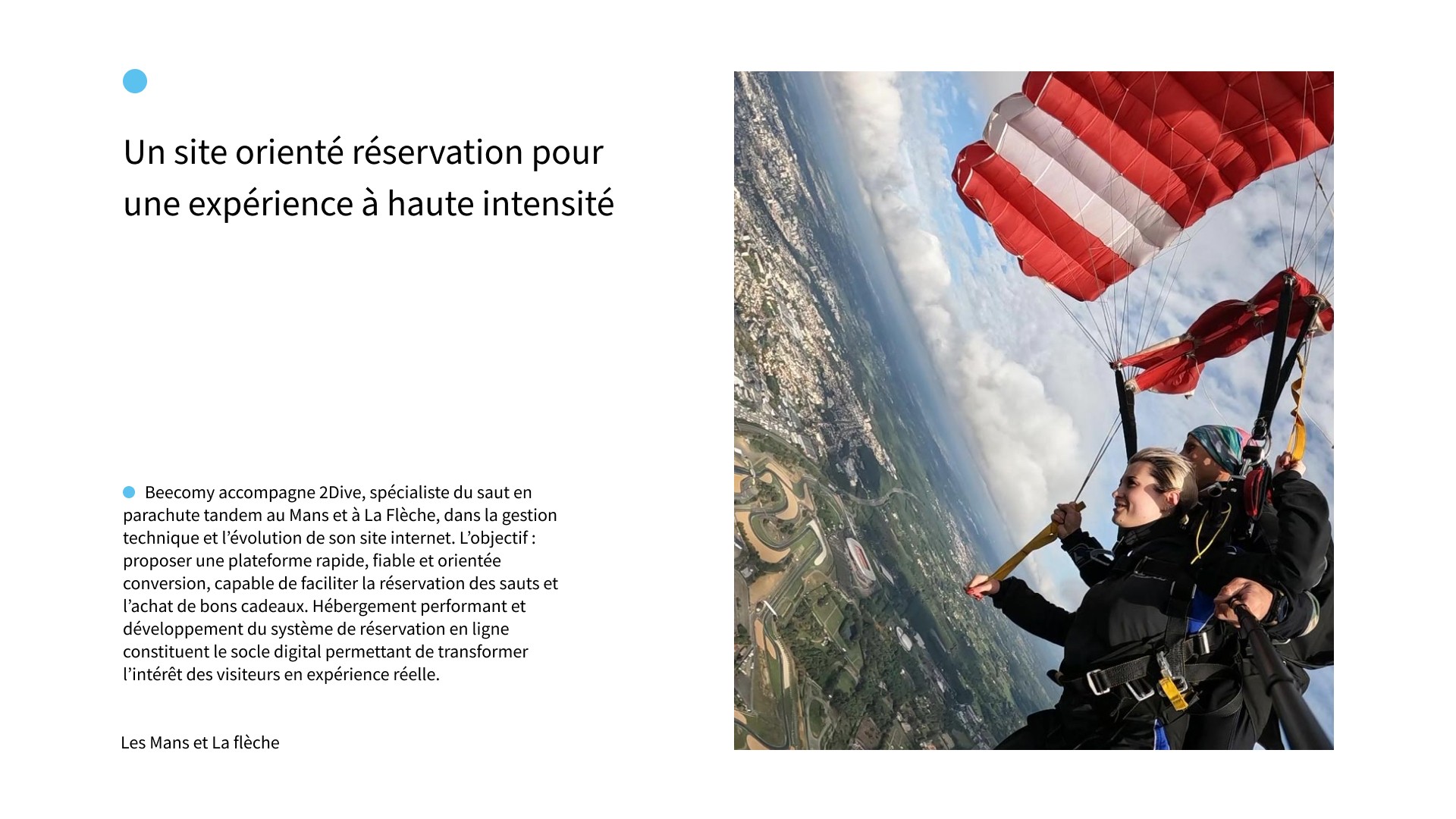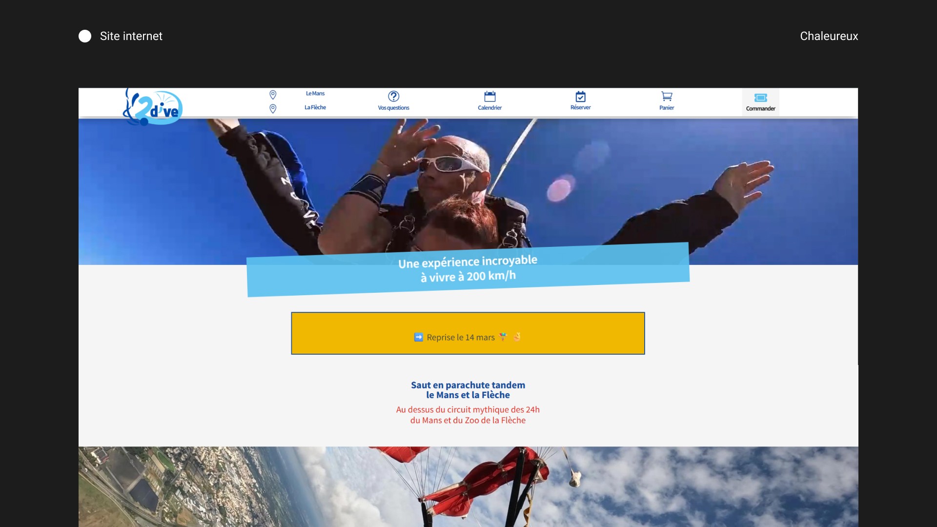 2Dive propose des sauts en parachute tandem au-dessus du circuit des 24 Heures du Mans et du Zoo de La Flèche, avec une promesse d’expérience forte, accessible et immédiatement compréhensible pour le grand public. Le site valorise clairement cette proposition à travers une navigation orientée action, avec des entrées visibles vers le calendrier, la réservation et l’achat de bons cadeaux.