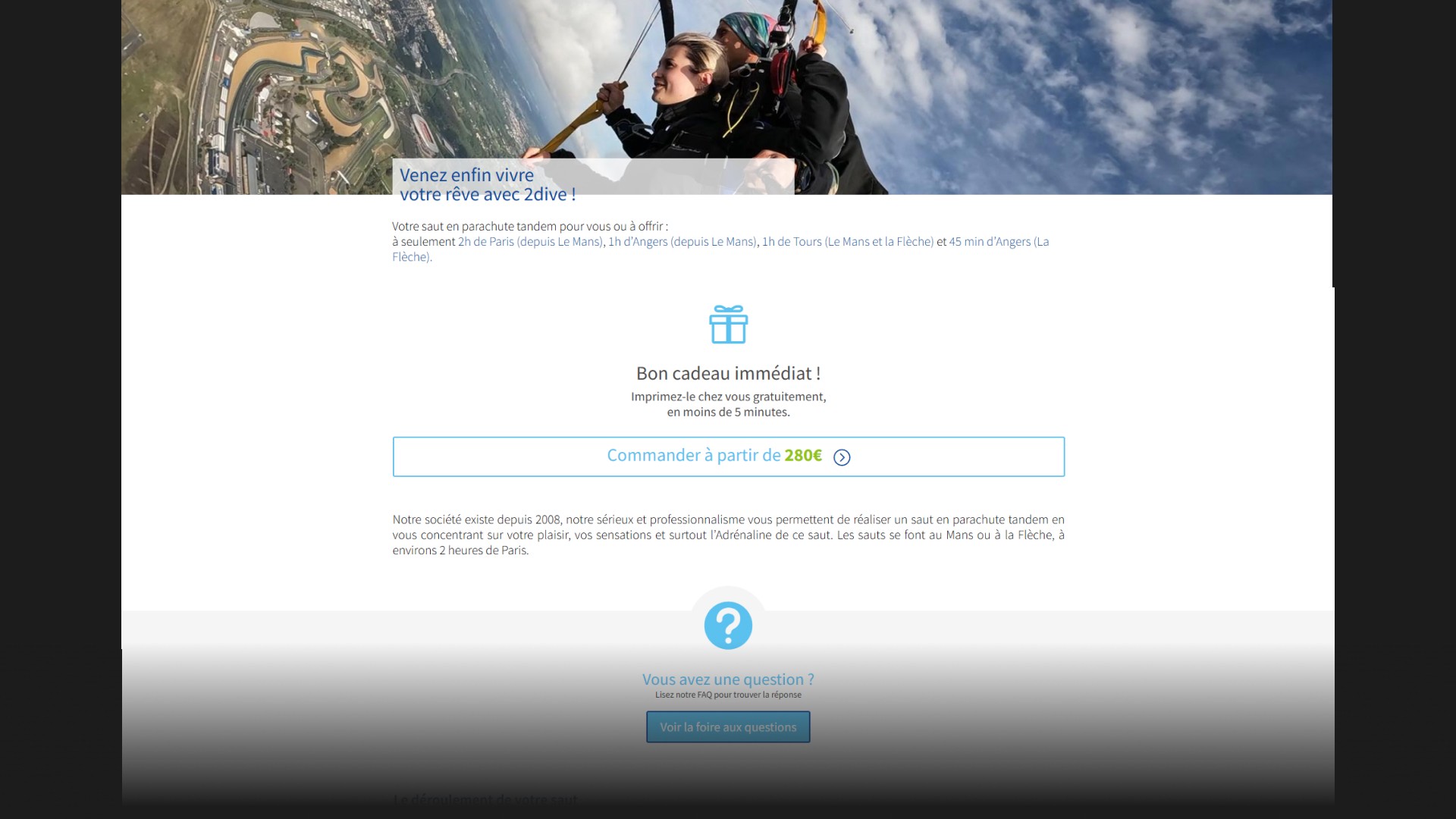 Le site de 2Dive adopte une structure très orientée résultat. L’utilisateur comprend immédiatement l’offre, les lieux de saut, les modalités de commande et les bénéfices de l’expérience. Le contenu valorise à la fois l’adrénaline du saut, le caractère mémorable de la prestation et les possibilités d’achat pour soi ou à offrir.