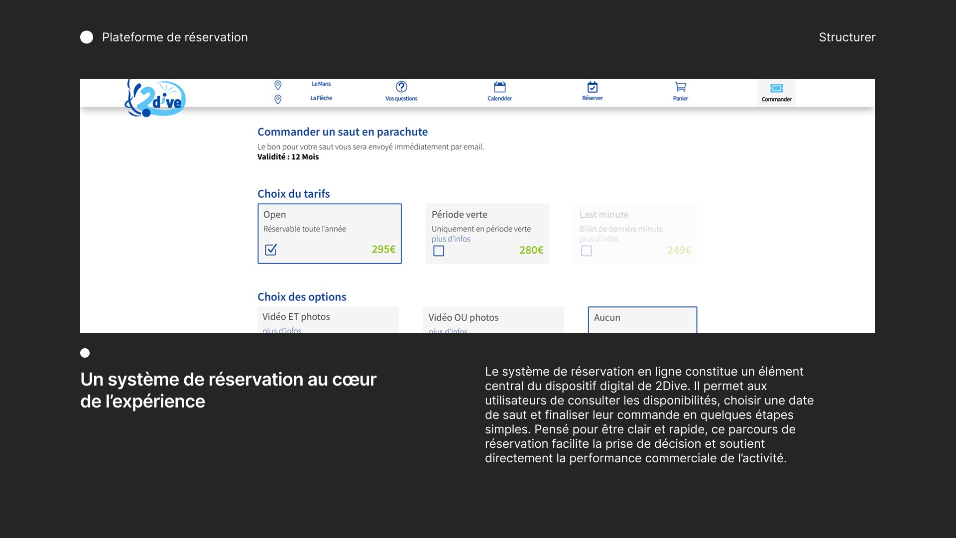 Le système de réservation constitue un élément central du dispositif digital de 2Dive. Le site met en avant la réservation de dates, l’achat de prestations, ainsi que la commande de bons cadeaux imprimables rapidement.