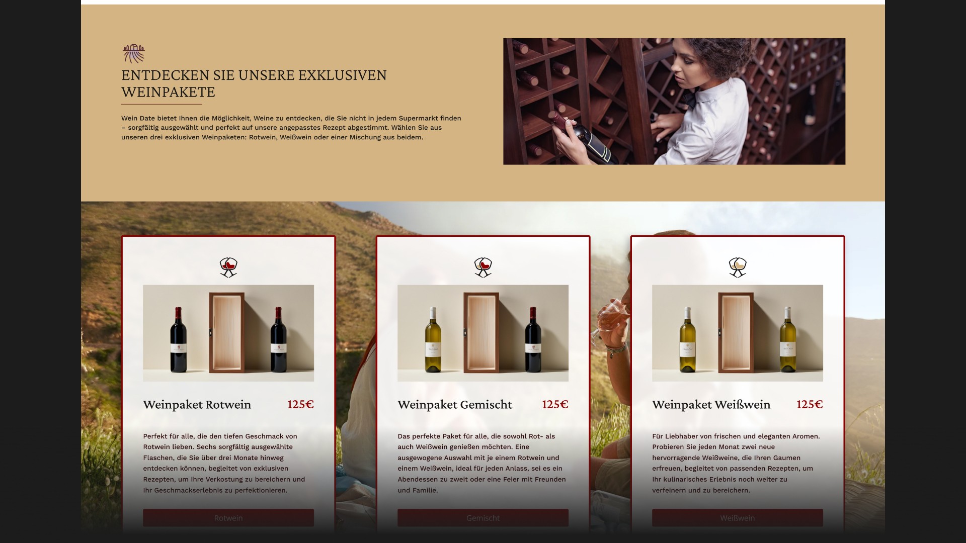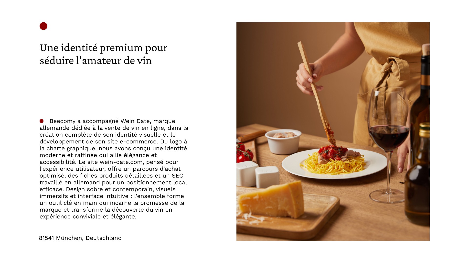 Wein Date est une marque allemande qui allie convivialité, raffinement et plaisir du vin. Son ambition : devenir une référence pour les amateurs de vins qui souhaitent acheter en ligne et découvrir de nouvelles bouteilles dans un univers moderne et élégant.